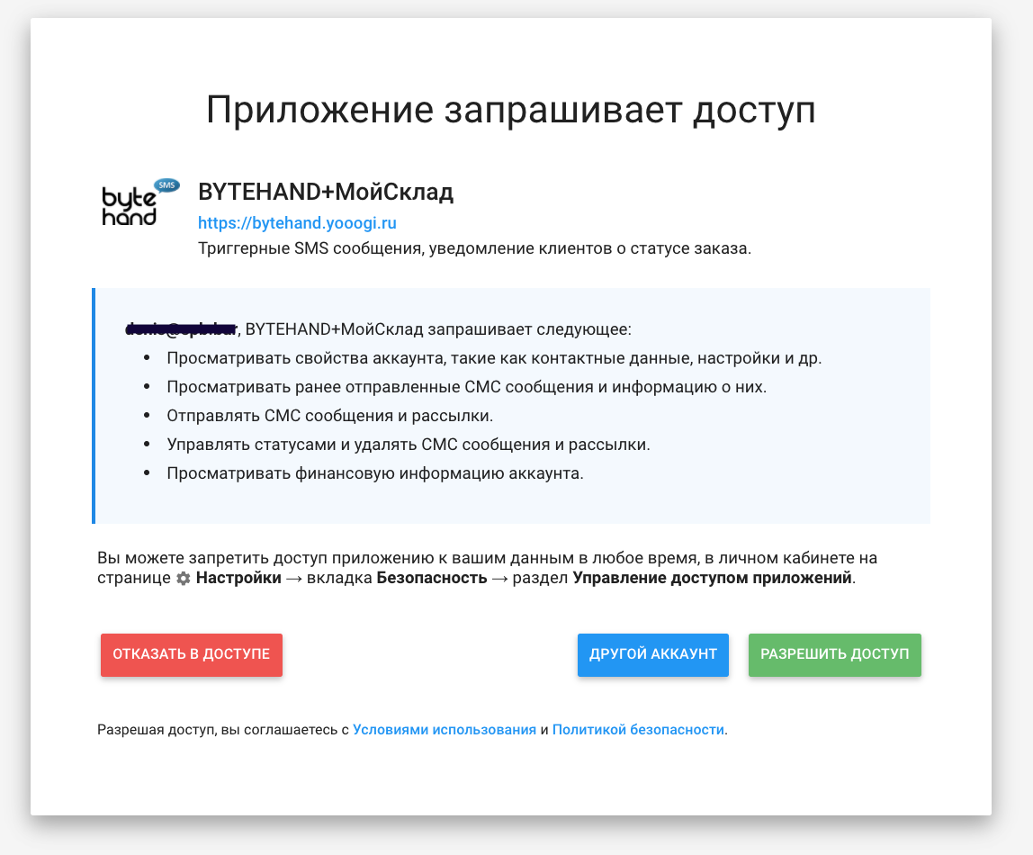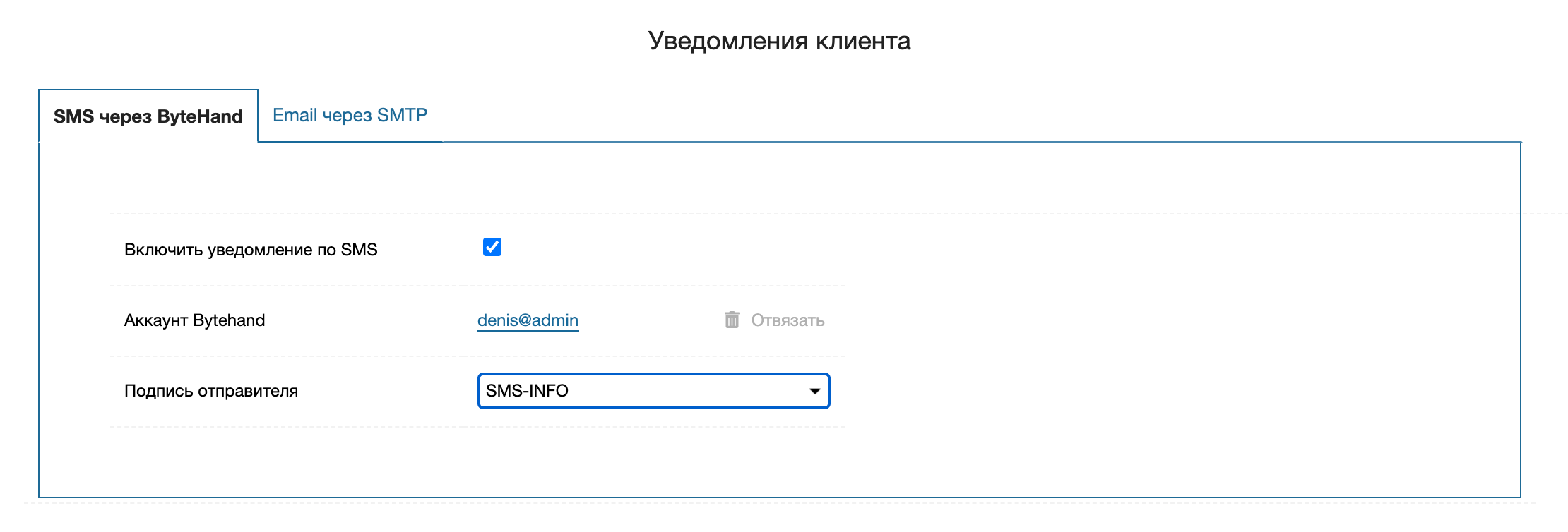 После предоставление доступа приложению, вы можете включить уведомления по SMS и выбрать подпись отправителя. Подробнее читайте в документации Bytehand