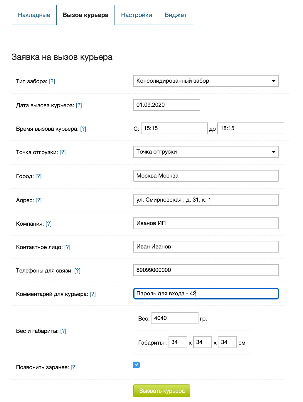 Ваша точка отгрузки СДЭК (договор), от которого будет вызываться курьер. При смене точки отгрузки контактные данные в форме вызова курьера поменяются автоматически.