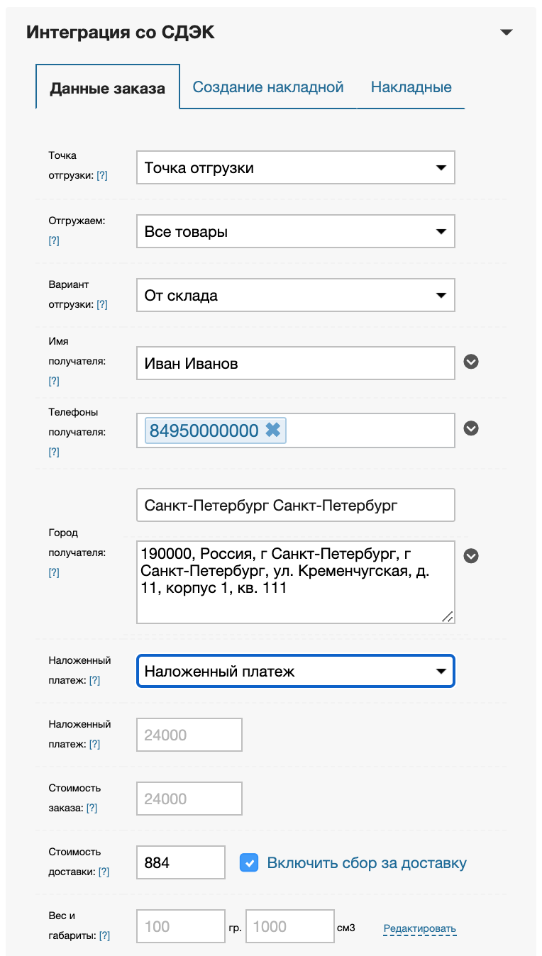 Данные заказа. Здесь пользователю предлагается решить какие данные нужно передать в СДЭК и перепроверить данные используемые для расчета (вес, габарит, наложенный платеж). В зависимости от настроек приложения в виджет автоматически подставляются данные клиента (имя, телефон, адрес).