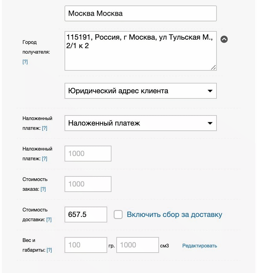 Важно заметить, что город определяется из адреса в МоемСкладе и сопоставляется с базой городов СДЭК. Правильность распознавание города из адреса не гарантируется, поэтому при оформлении стоит уделять отдельное внимание этому полю.