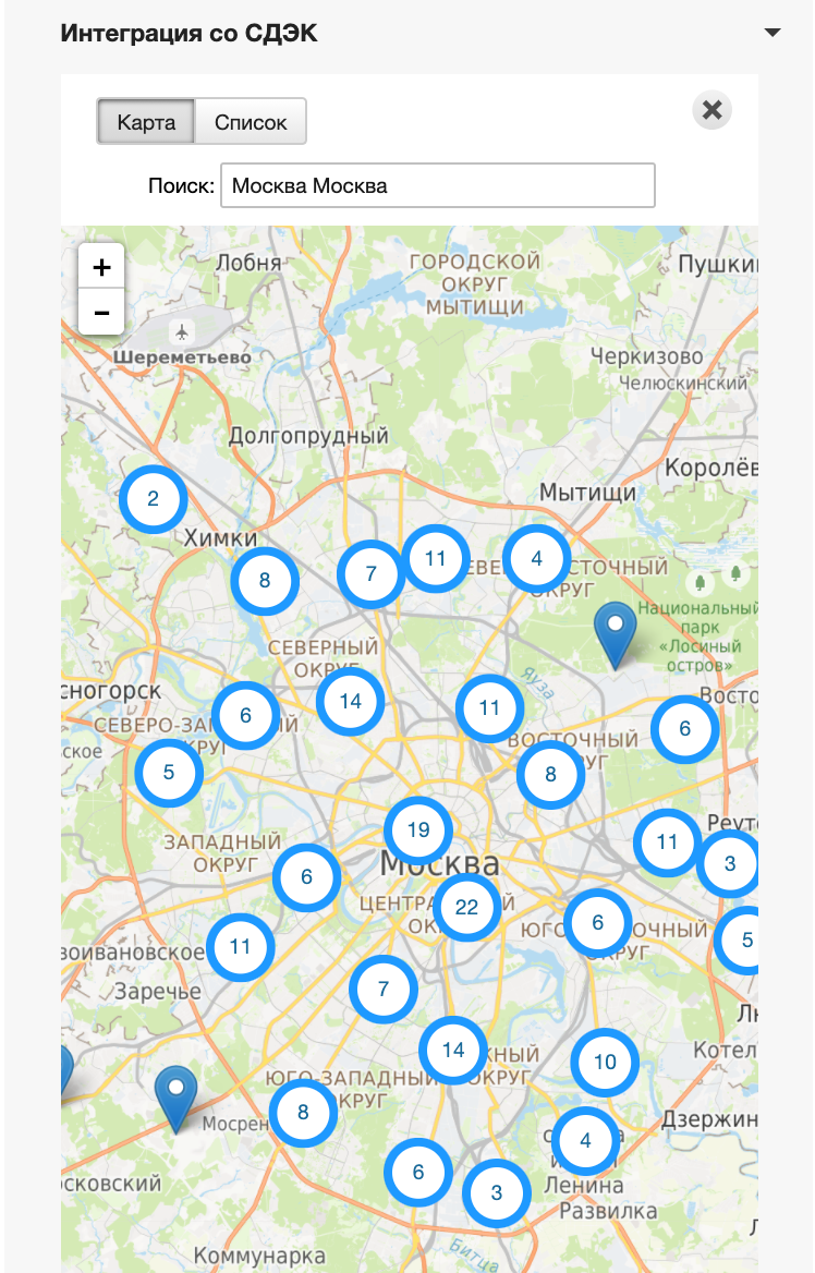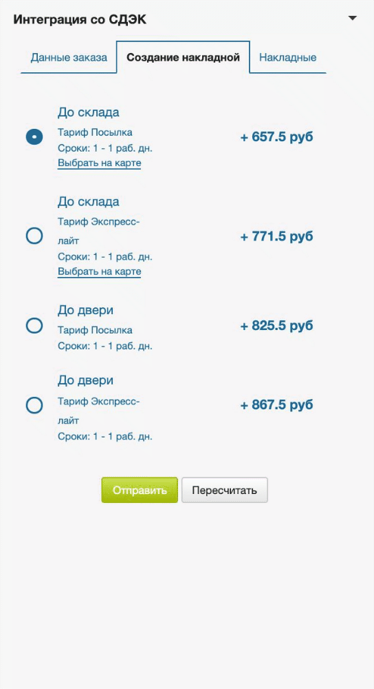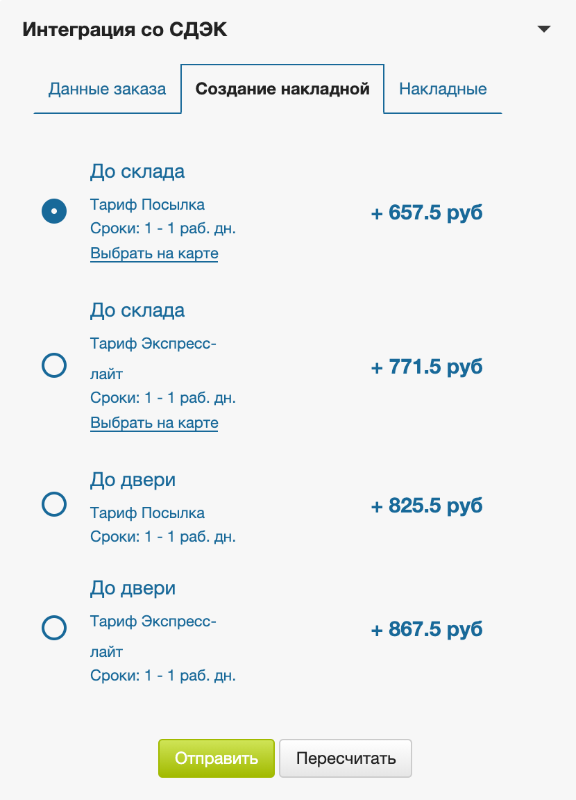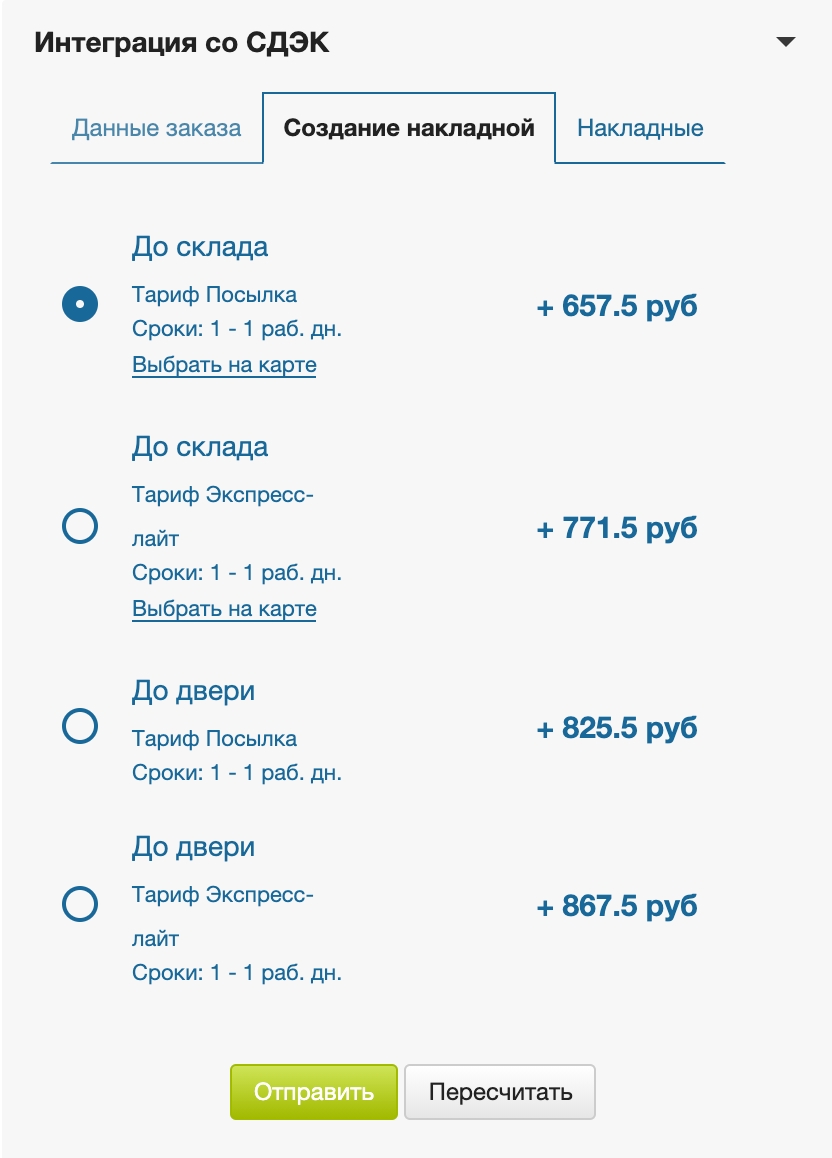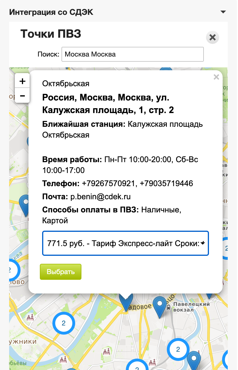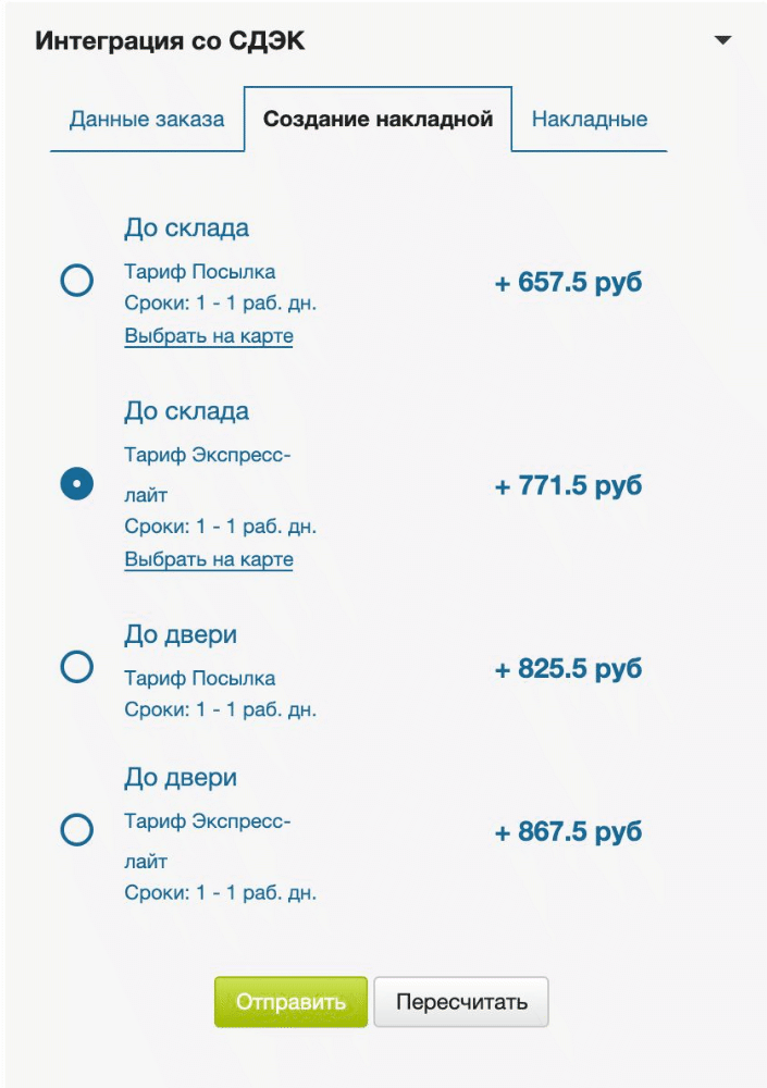 В этой части виджета выводятся точки ПВЗ и стоимость по тарифам, доступным для отправления по заданным параметрам из вкладки Данные заказа