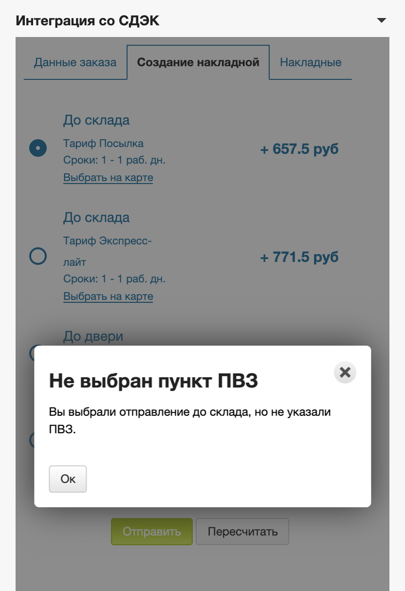Если пользователь не выберет точку ПВЗ при заказе по тарифу До склада, он получит сообщение с предупреждением, а заказ не оформится.