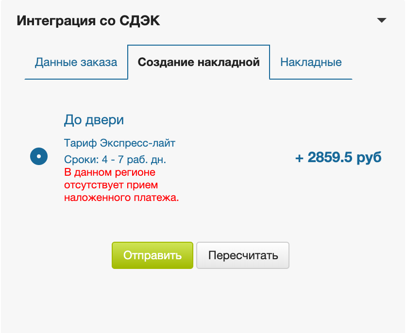Если в городе получателя недоступен Наложенный платеж, пользователь получает уведомление при расчете цены, а опция Наложенный платеж переключается в значение "Без наложенного платежа" автоматически